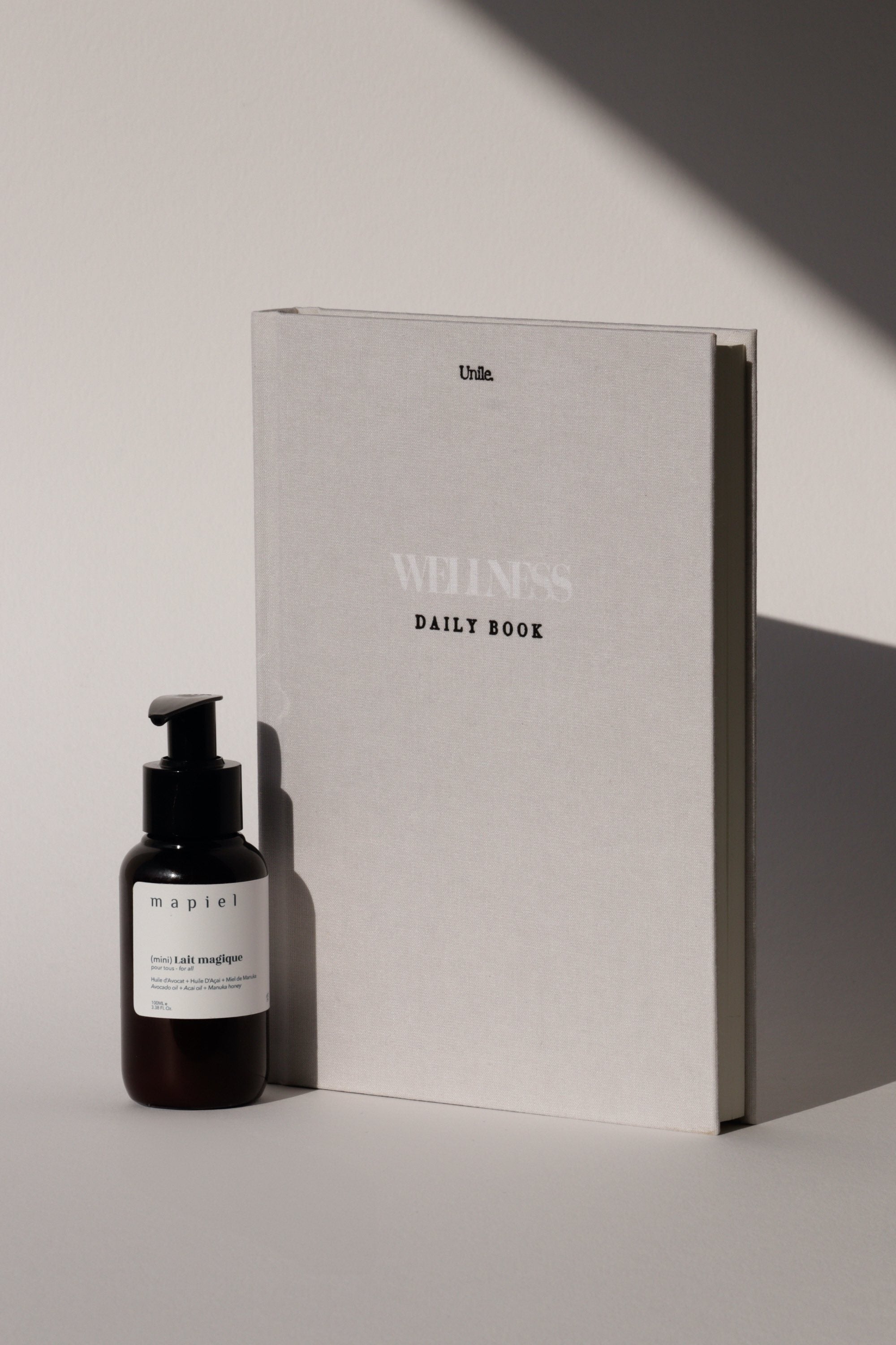 Le Wellness book Unile: un carnet de journaling unique pour suivre vos routines et gestes bien-être au quotidien. 100 jours de suivi au plus près de votre santé pour vous inciter à développer votre recherche du bien-être, du mieux, à votre rythme et surtout, avec beaucoup d'équilibre
